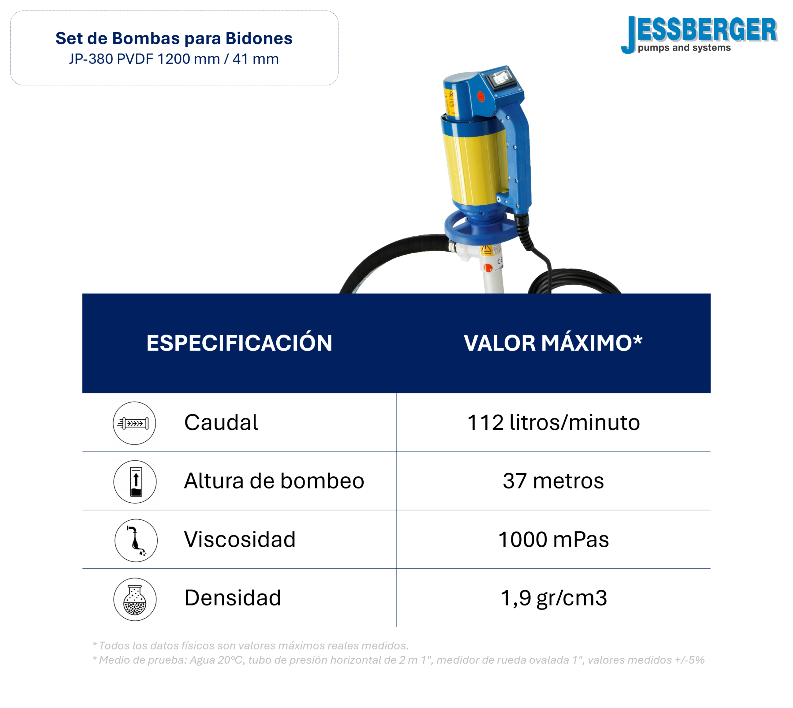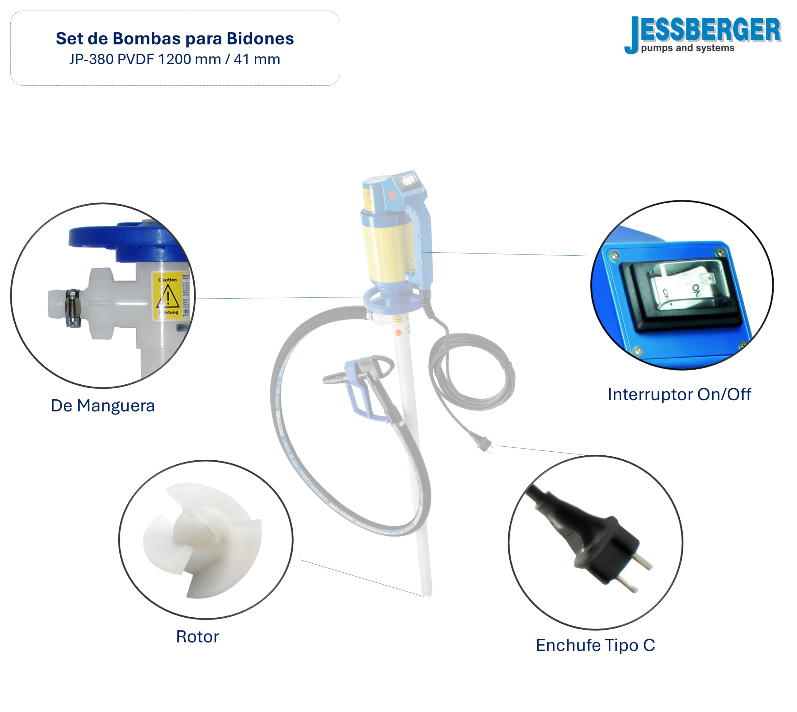 JP-380 PVDF 1000, motor universal 230 V, 50/60 Hz, 640 W, clase de protección IP 55, Interruptor de encendido/apagado, cable de 5 m con enchufe a prueba de golpes, con disyuntor, control de velocidad integrado.